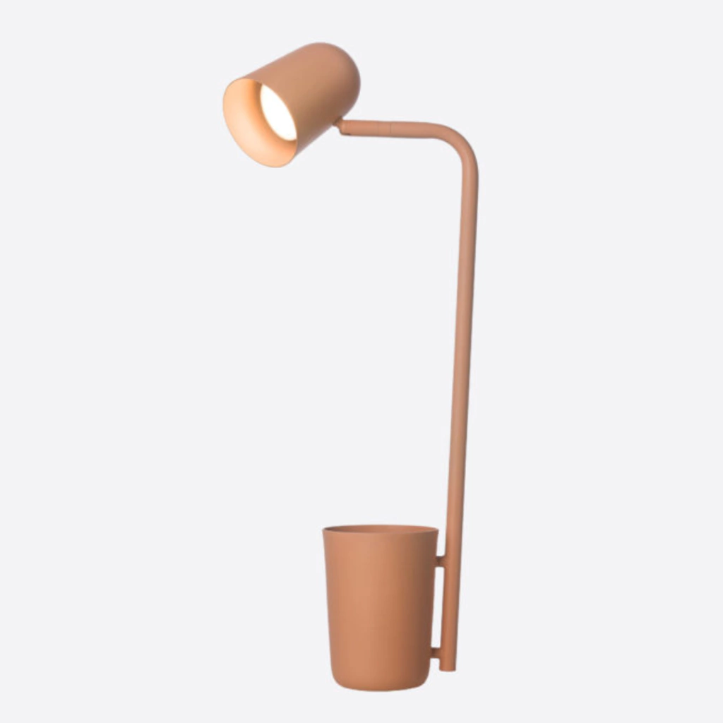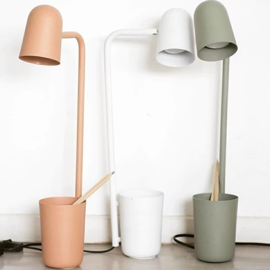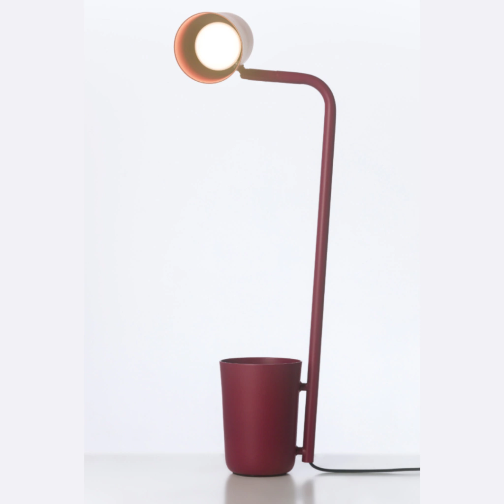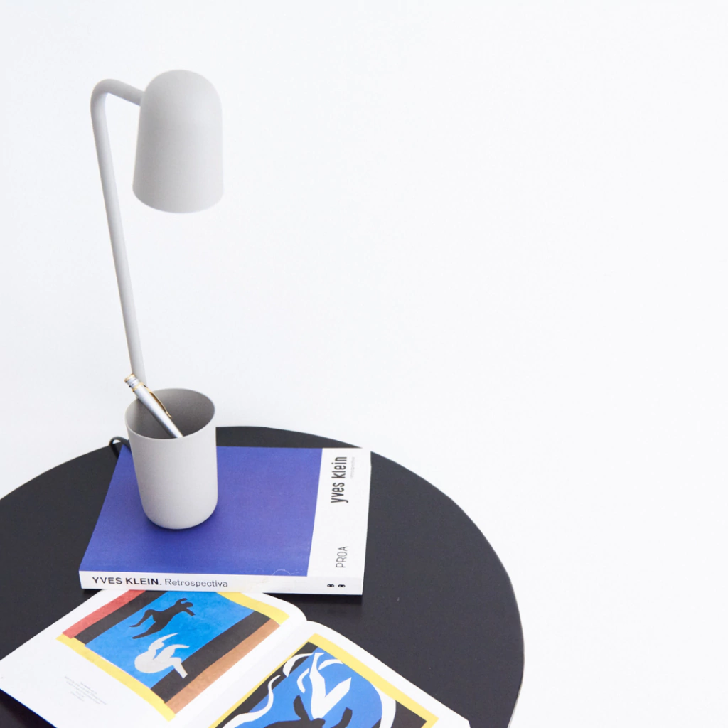 Lámpara de diseño, su uso es ideal para escritorios y oficinas. Construida en hierro, con rótula metálica para direccionar el foco de luz. Cable textil.