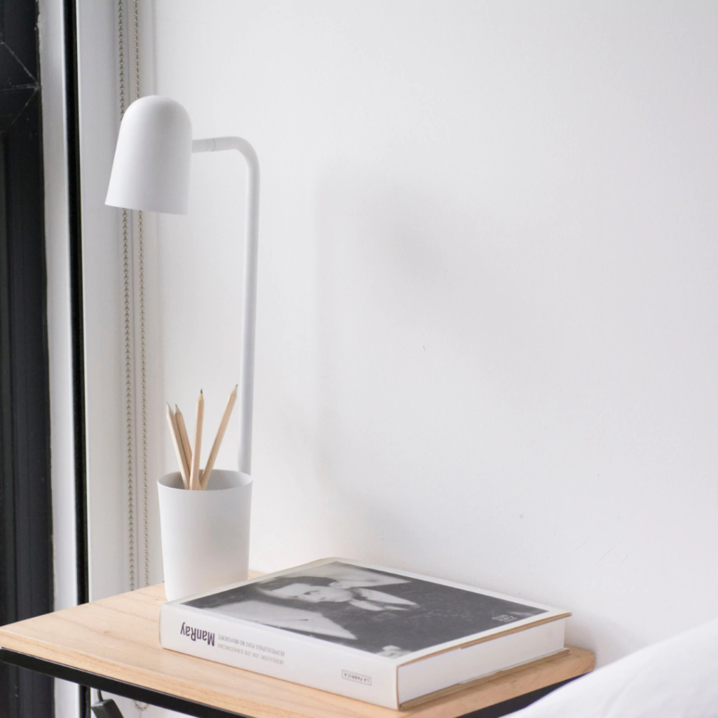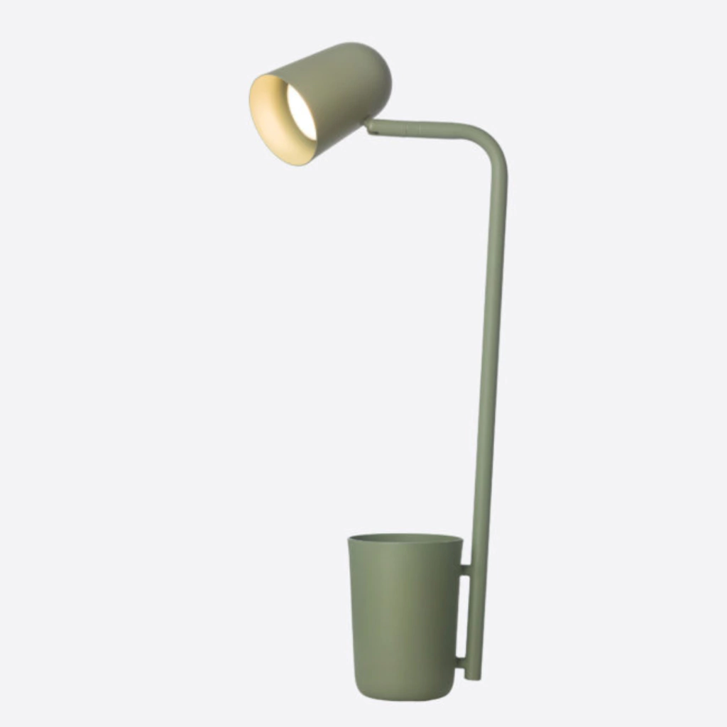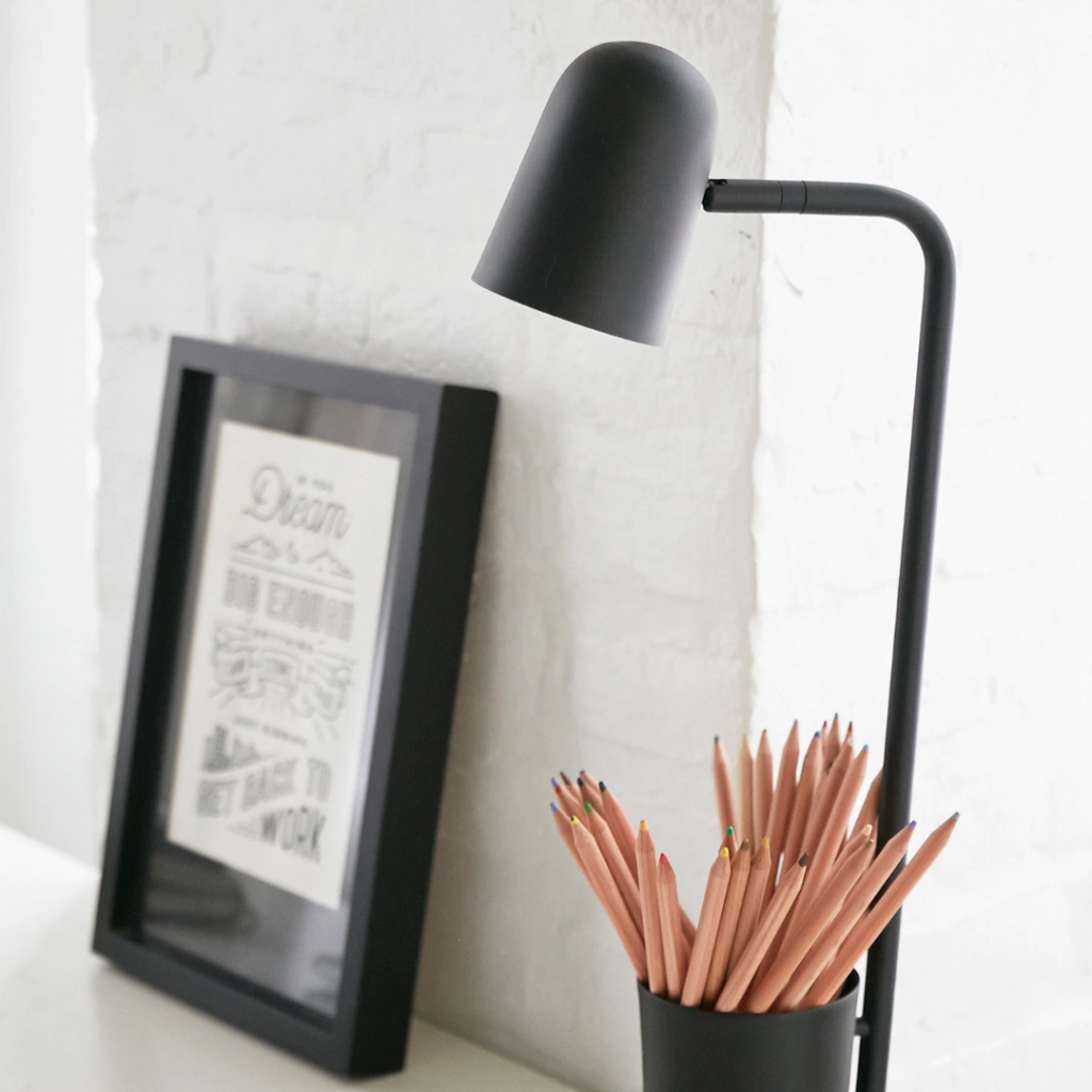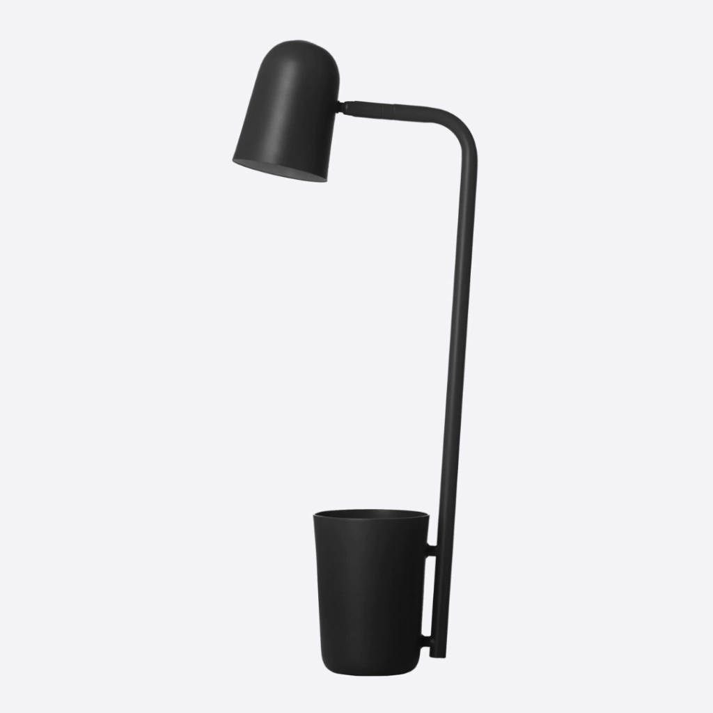 Lámpara de diseño, su uso es ideal para escritorios y oficinas. Construida en hierro, con rótula metálica para direccionar el foco de luz. Cable textil.